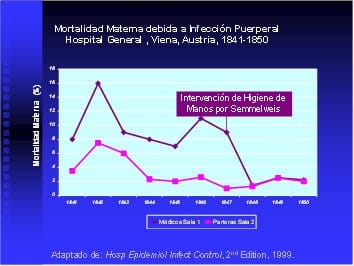 En la sala 1ª de obstetricia del Gran Hospital General de Viena, a mediados del siglo XIX, la mortalidad por fiebre puerperal era del 10% mientras que en el mismo Hospital, en la sala 2ª era del 4%. Intrigado por esta diferencia, Ignaz Semmelweis examinó escrupulosamente todos los detalles de la atención profesional, condiciones ambientales y singularidades de pacientes. Llegó a la conclusión de que los estudiantes de Medicina transportaban “partículas de cadáver” en sus manos desde la sala de autopsias a la de partos. Tomó una serie de medidas higiénicas y consiguió normalizar la mortalidad.