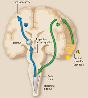 Los desencadenantes calientan la cabeza, la excitan, y desencadenan la “onda de depresión cortical propagada”. Esta onda enciende los sensores meníngeos y por eso duele.