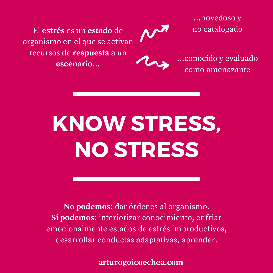 podemos, desde la conciencia, interiorizar el conocimiento, enfriar emocionalmente los estados de estrés improductivos, tratar de desarrollar conductas adaptativas, aprender… Know stress, no stress