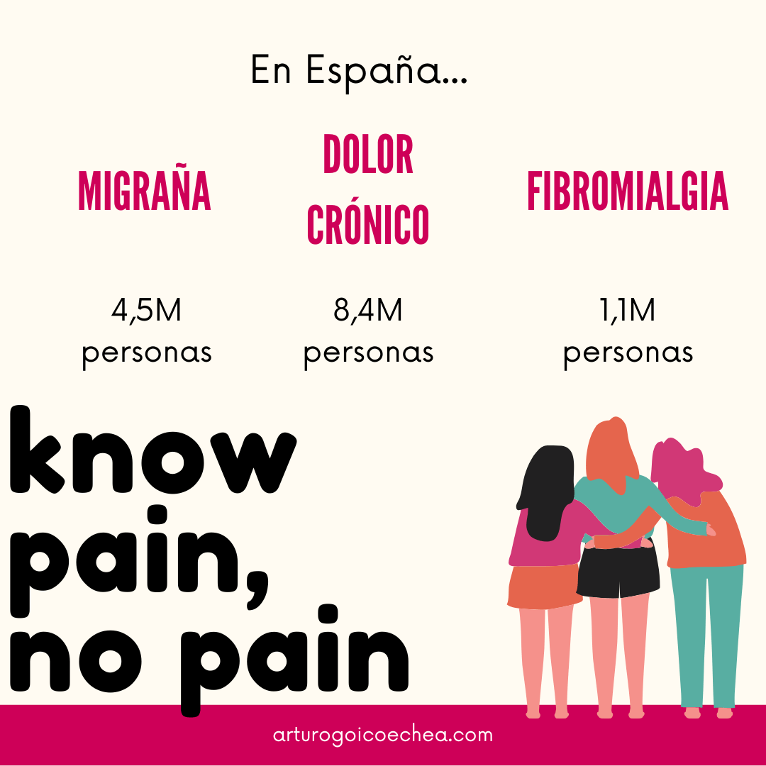 Por citar algunas: migraña: 4,5 millones la sufren en España. De ellas, 2 millones, de forma crónica (más de 15 días al mes, al menos desde hace 3 meses). Un 18% sufre dolor crónico. 2, 4% de la población adulta padece fibromialgia.