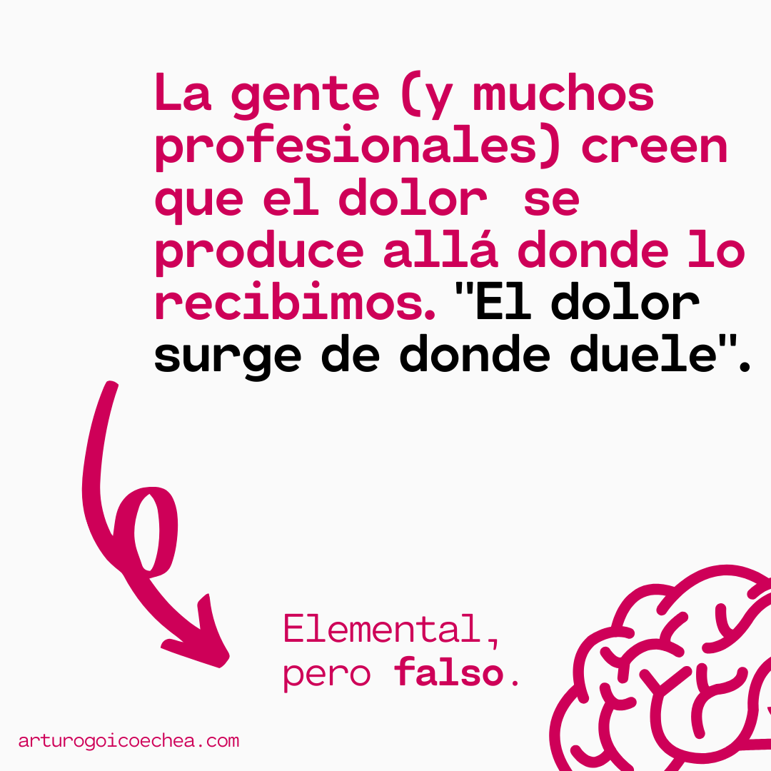 El ciudadano (y muchos profesionales) creen que el dolor o cualquier otra percepción se produce allá donde la recibimos. “El dolor surge de donde duele”. Elemental… pero falso.